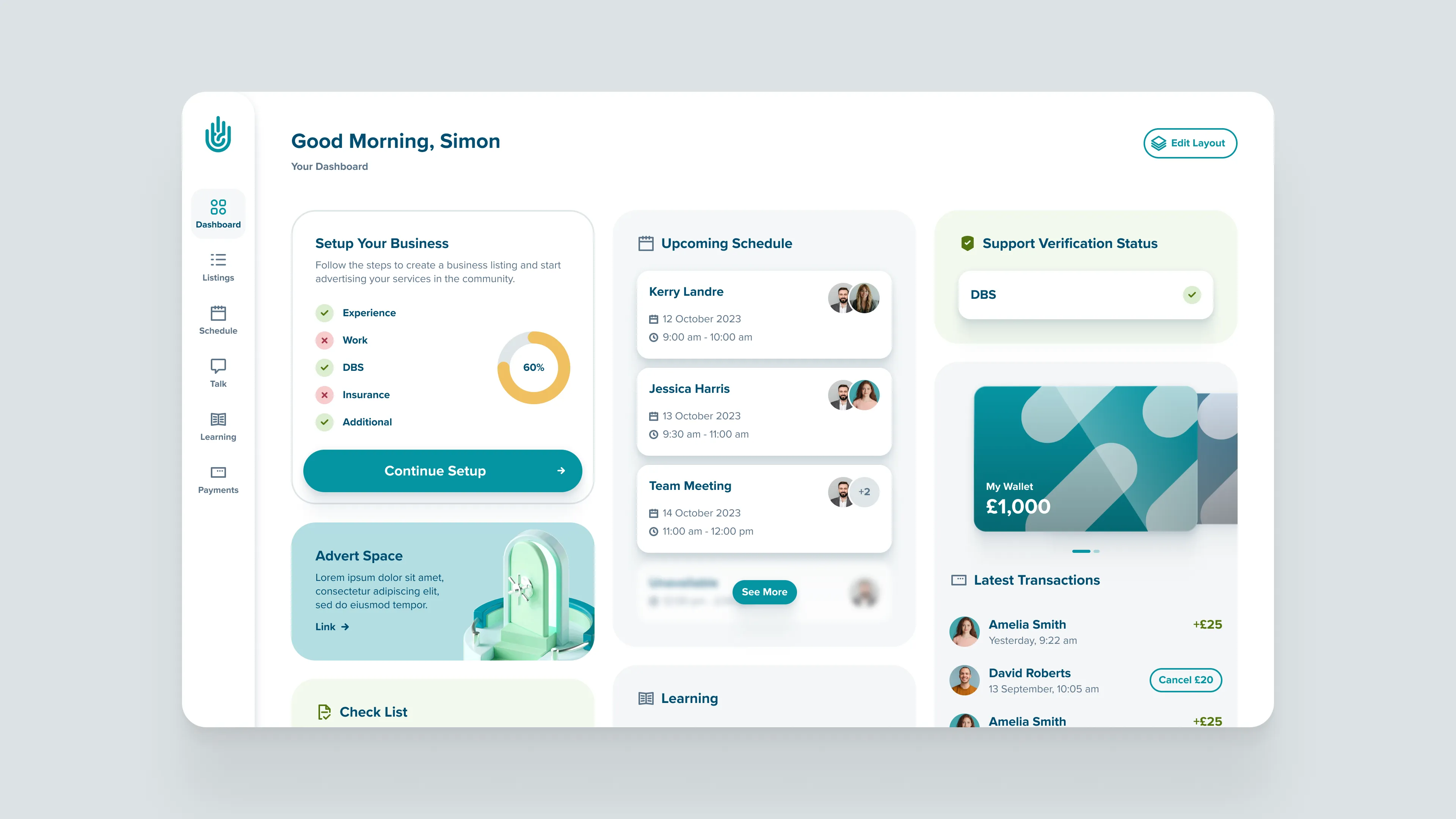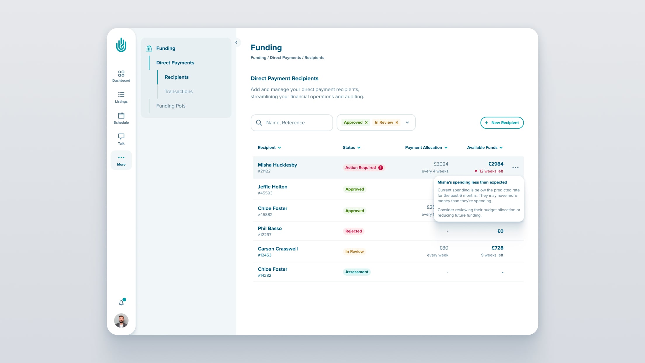 As part of a service change (from Stripe to MangoPay) we redesigned our payment experience, introducing virtual wallets, enabling councils and local authorities to fund and manage service users accounts. We surfaced key actions that were previously hidden in menus. This made it easier for users to make and receive payments on the platform.